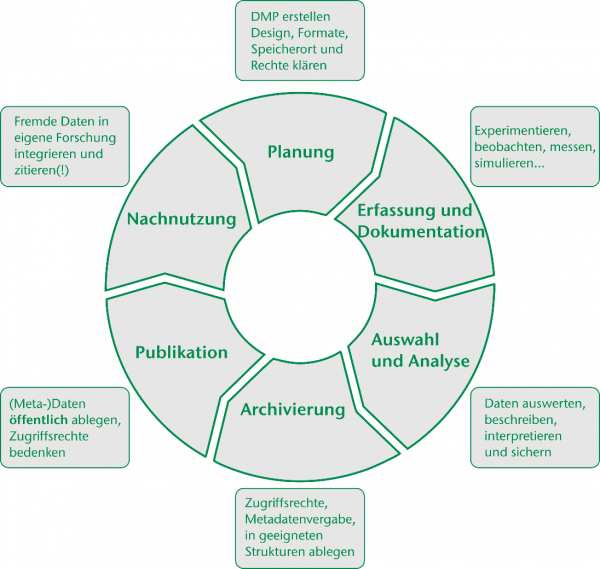 Bei der Planung eines Forschungsvorhabens mit Hilfe eines Datenmanagmentplans werden die weiteren Phasen bereits mit gedacht und beschrieben.